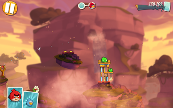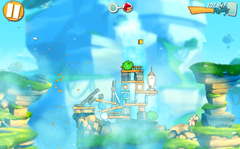 Angry Birds 2 (Événement du 15e anniversaire) propose un environnement de jeu vibrant et redessiné avec une esthétique festive qui semble dynamique et enjouée. Les oiseaux classiques comme Red, Bomb et Chuck restent centraux, bien qu'ils soient maintenant rejoints par des variations exclusives à l'anniversaire qui sont ornées de costumes thématiques, renforçant le facteur nostalgie. Comme toujours, l'objectif est de renverser des tours et des structures créativement construites par les cochons.